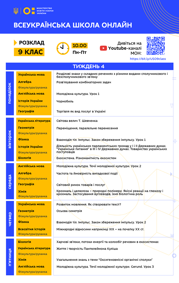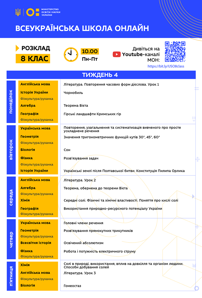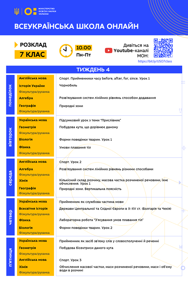 Традиційно ділимося з вами розкладом на тиждень, де заздалегідь вказані теми кожного уроку.