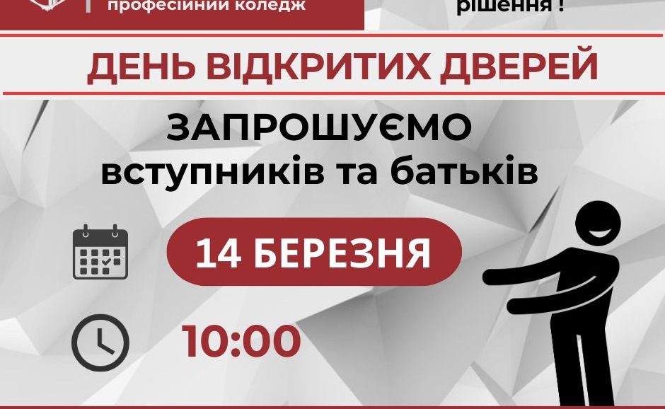 14 березня Квасилівський інженерно-технологічний професійний коледж запрошує всіх, хто шукає перспективну освіту та прагне стати справжнім професіоналом. Це чудова можливість дізнатися більше про спеціальності, навчальний процес і можливості працевлаштування.