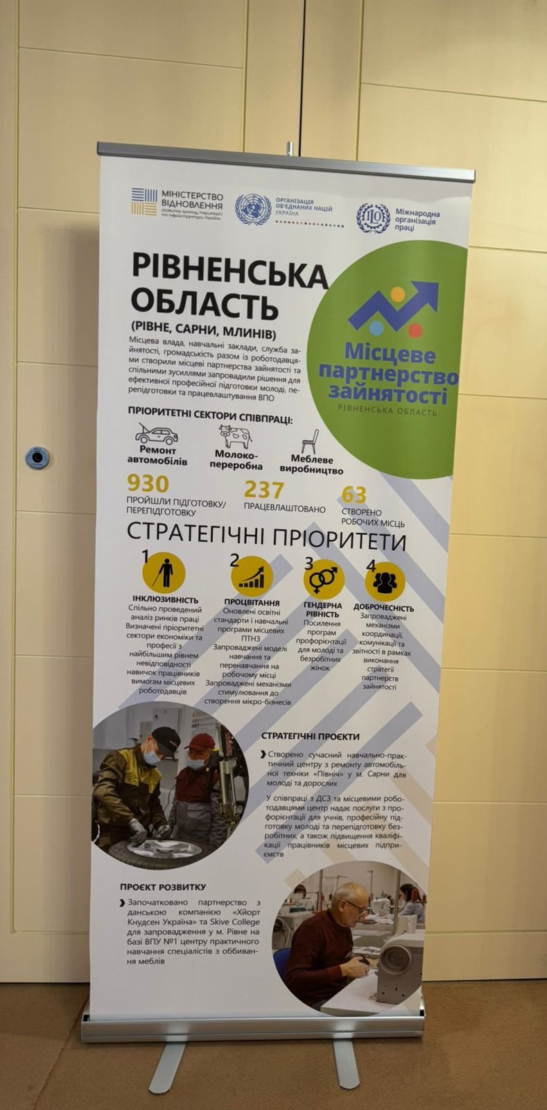 Рівненщина розпочала співпрацю з МОП у 2018 році в рамках впровадження місцевого партнерства зайнятості. Ключовим завданням стало – допомогти молоді та людям постраждалим від війни отримати необхідні навички для працевлаштування, а роботодавцям – створювати робочі місця та отримувати кваліфікований персонал. Завдячуючи спільним зусиллям було створено сучасний Центр технологій з ремонту автомобільного транспорту «Північ» на базі закладу професійної освіти. Синергія зусиль з усіх партнерів Центр став багатофункціональний, ефективним, результативним.