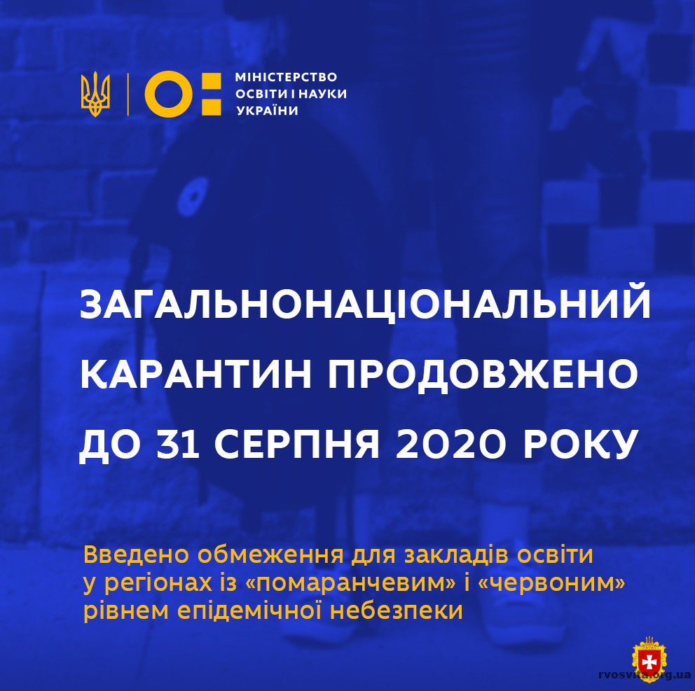 Загальнонаціональний карантин, встановлений через пандемію COVID-19, продовжено до 31 серпня 2020 року. В регіонах встановлюватиметься один з чотирьох рівнів епідемічної небезпеки, два з яких мають обмеження для діяльності закладів освіти. Відповідне рішення Уряд ухвалив 22 липня 2020 року.