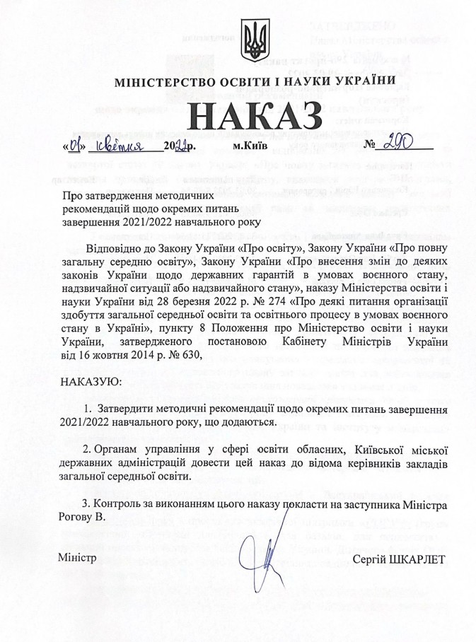 1 квітня Міністерством освіти і науки України затверджено методичні рекомендації щодо окремих питань завершення 2021/2022 навчального року.