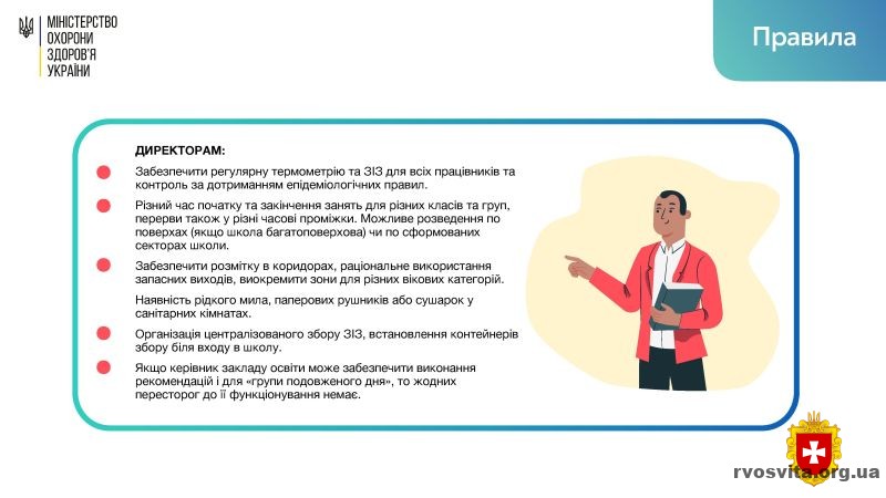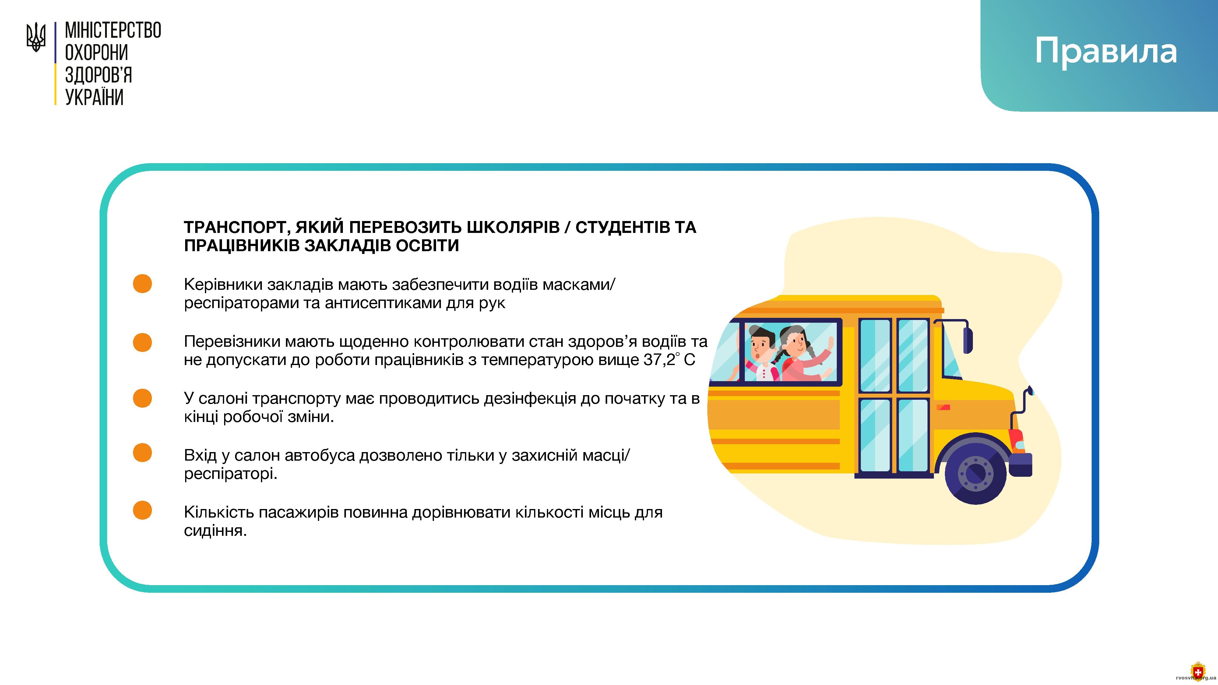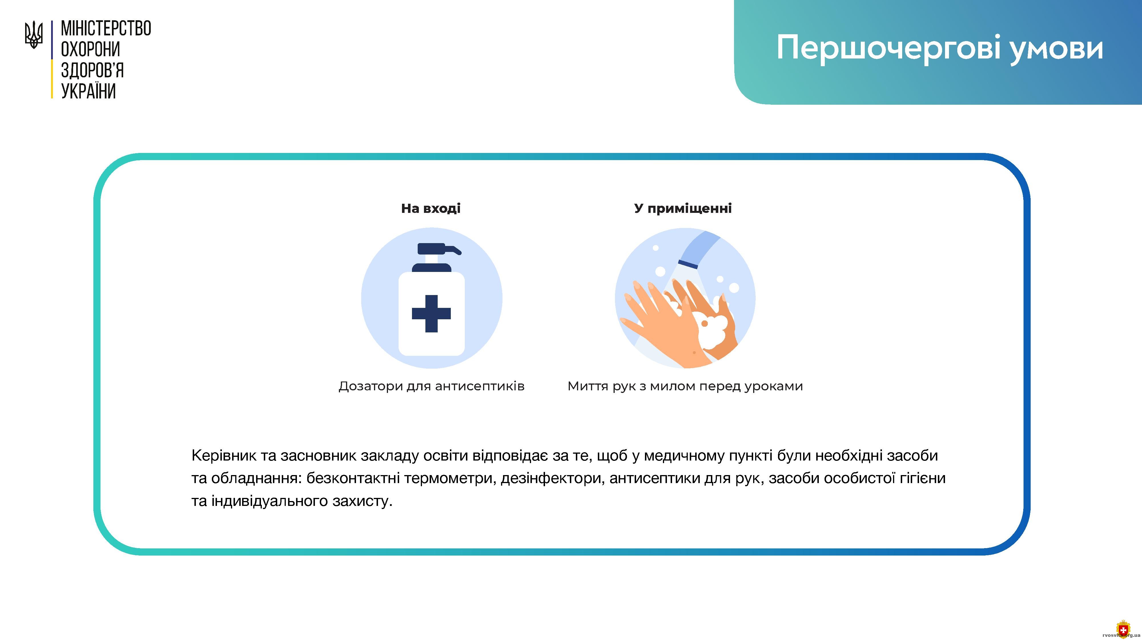 За рекомендаціями МОЗ усі навчальні заклади повинні бути забезпечені достатньою кількістю безконтактних термометрів, дезінфекторів, антисептиків для рук, засобів особистої гігієни та індивідуального захисту. Перед входом до закладу освіти мають бути встановлені антисептики, а учні перед уроками повинні мити руки з милом. Перед початком робочого дня увесь персонал проходить температурний контроль.