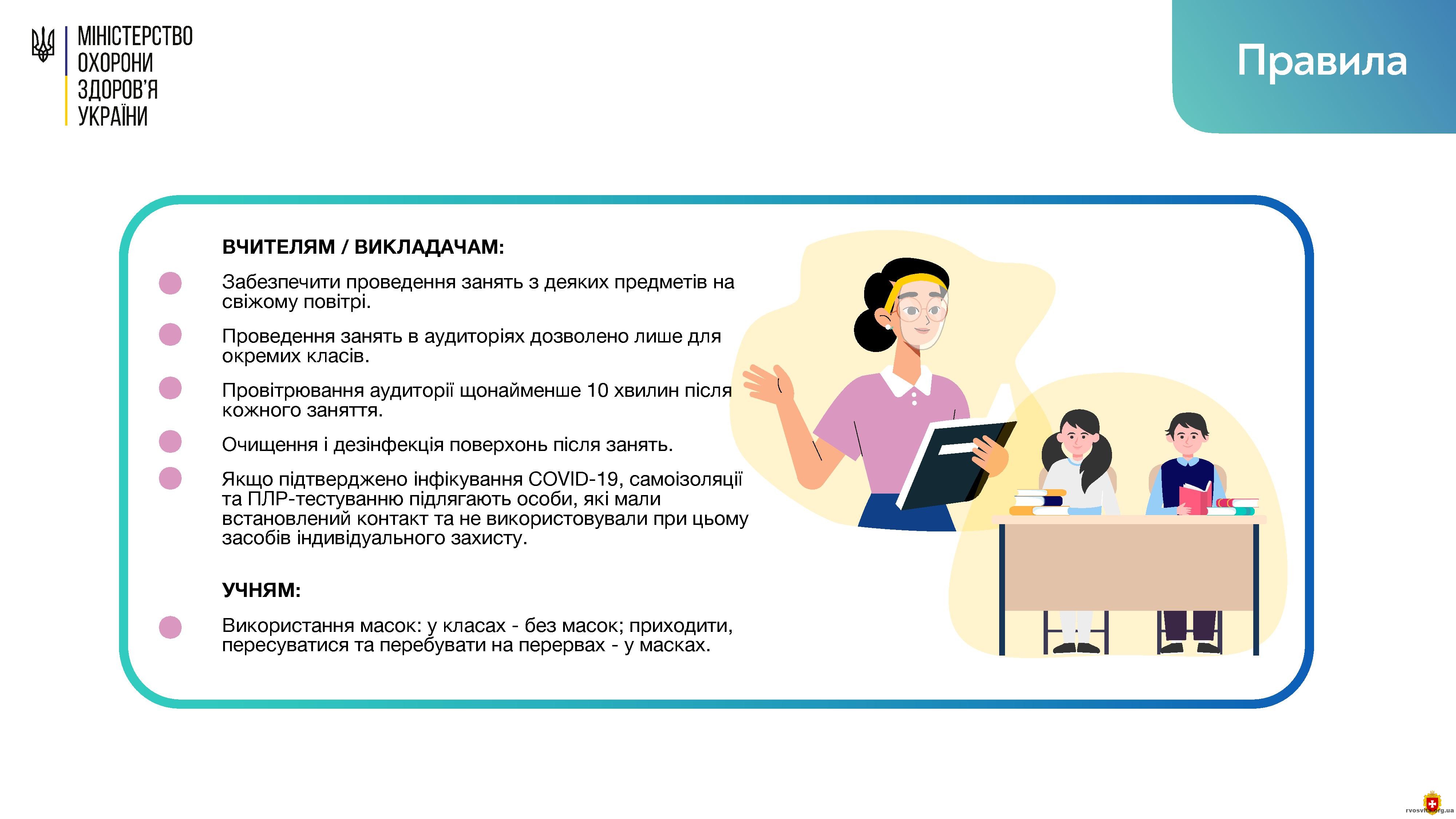 Міністерство також рекомендує проводити заняття з деяких предметів (на розсуд учителя) на свіжому повітрі і максимально скоротити пересування дітей між класами.