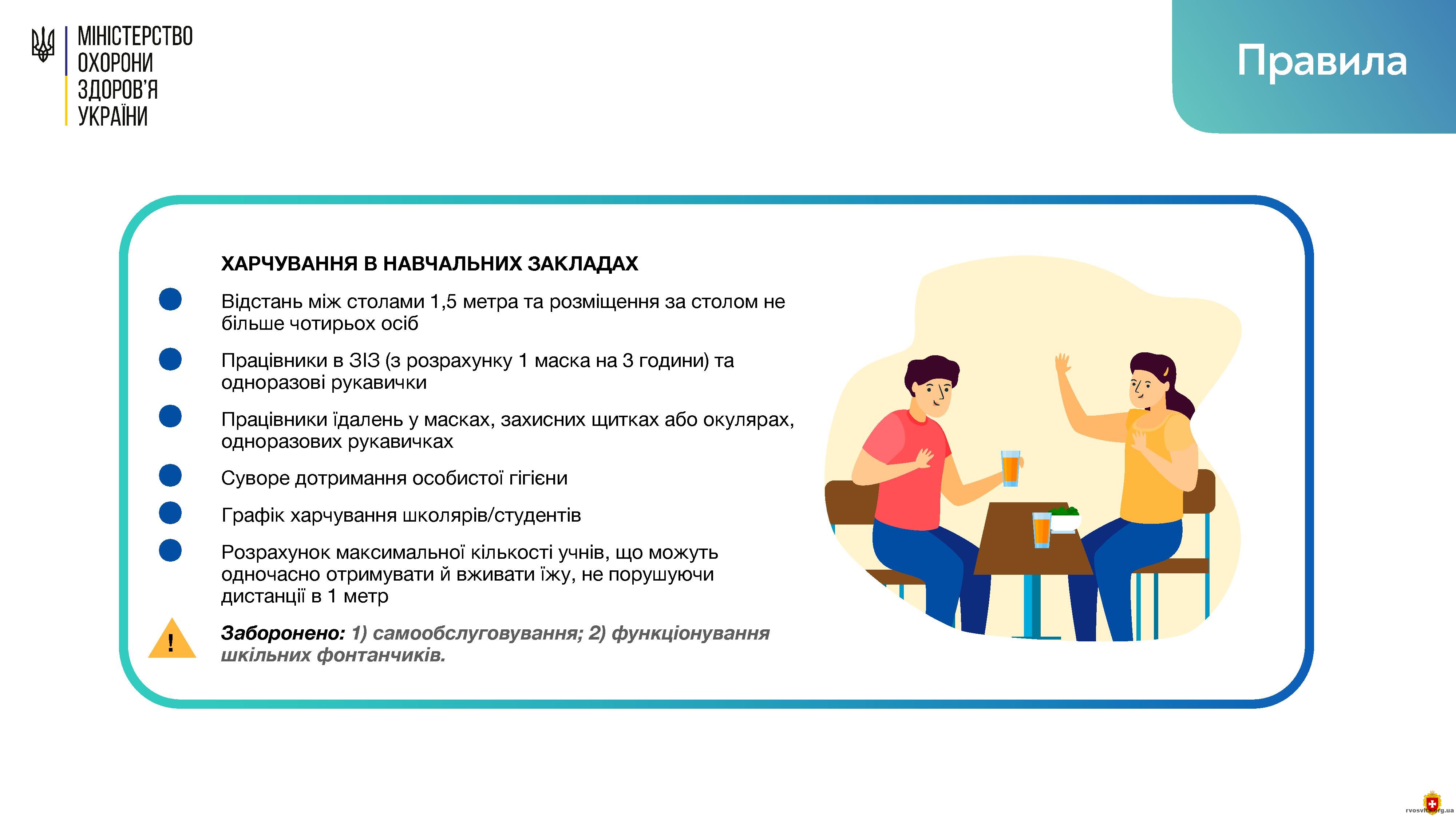 Харчування у школах має бути організовано так, щоб дотримуватися відстані 1,5 м між столами та 1 м між дітьми. Забороняється використання формату “шведський стіл”.