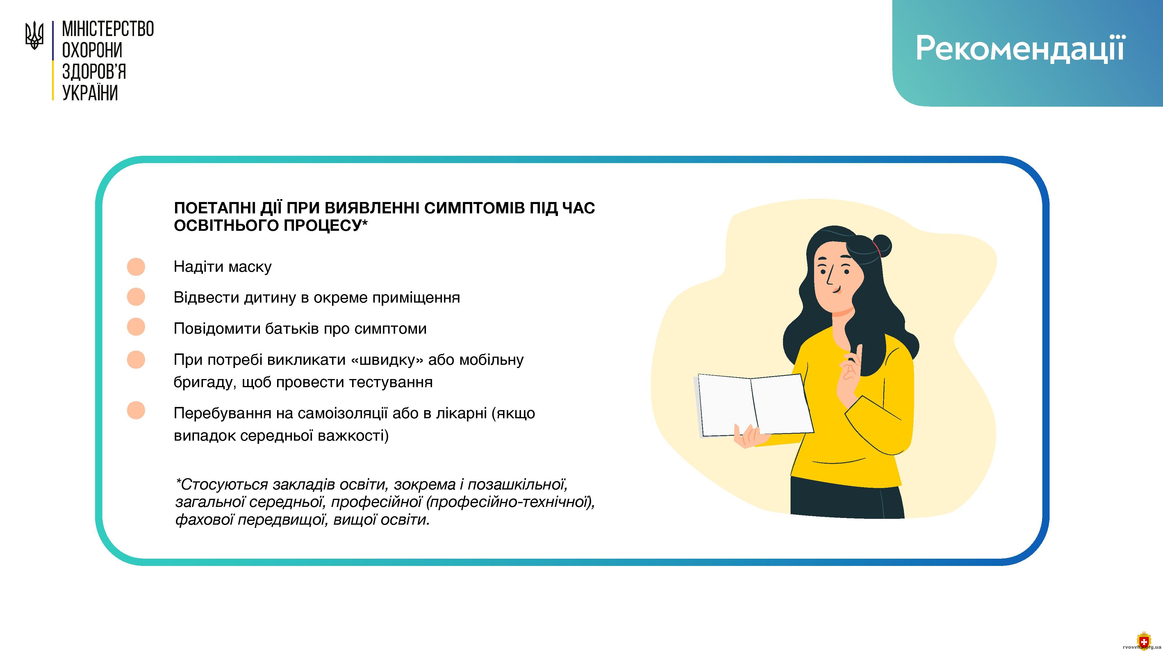У разі виявлення симптомів захворювання у дитини під час занять на неї треба надіти маску, відвести в окреме приміщення та повідомити батьків. Після цього вони мають звернутися до сімейного лікаря, який забезпечить приїзд бригади «швидкої», якщо цього потребує стан дитини. Рішення про ізоляцію контактних з хворим осіб прийматиме лікар-епідеміолог після підтвердження випадку COVID-19.