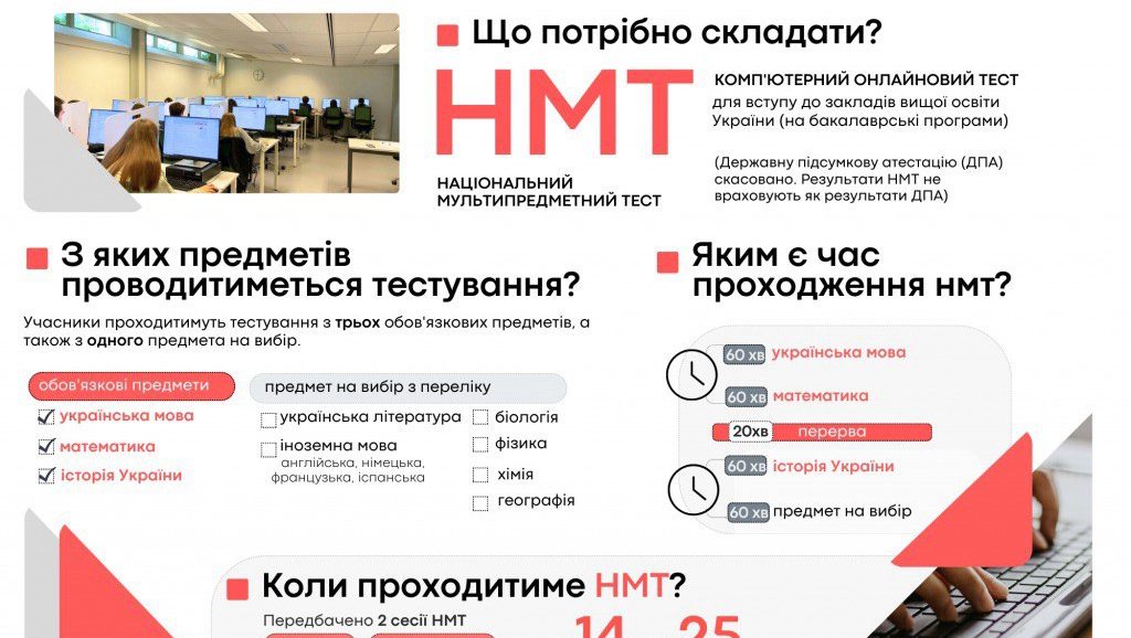 Кожен учасник НМТ проходитиме тестування в один день у два етапи. Під час першого етапу, який триватиме 120 хвилин, потрібно буде виконати завдання з української мови та математики, а під час другого, теж тривалістю 120 хвилин, — з історії України та навчального предмета на вибір, вказаного під час реєстрації для участі в НМТ. Між етапами буде 20-хвилинна перерва.