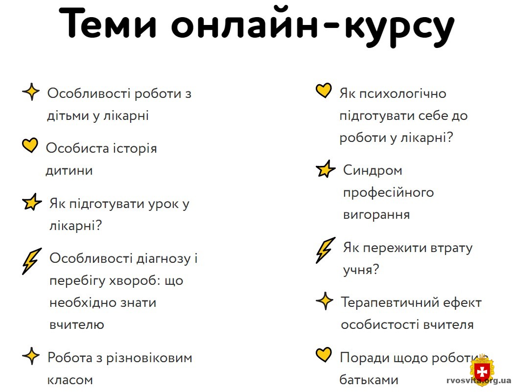 Під час навчання ви дізнаєтеся про особливості викладання в лікарняних умовах і зможете подолати власні сумніви й бар’єри в цьому процесі. Лектори розкажуть про перебіг основних форм хвороб, про вашу психологічну підготовку до викладання в медичних закладах. А також про те, як мотивувати дітей до навчання.