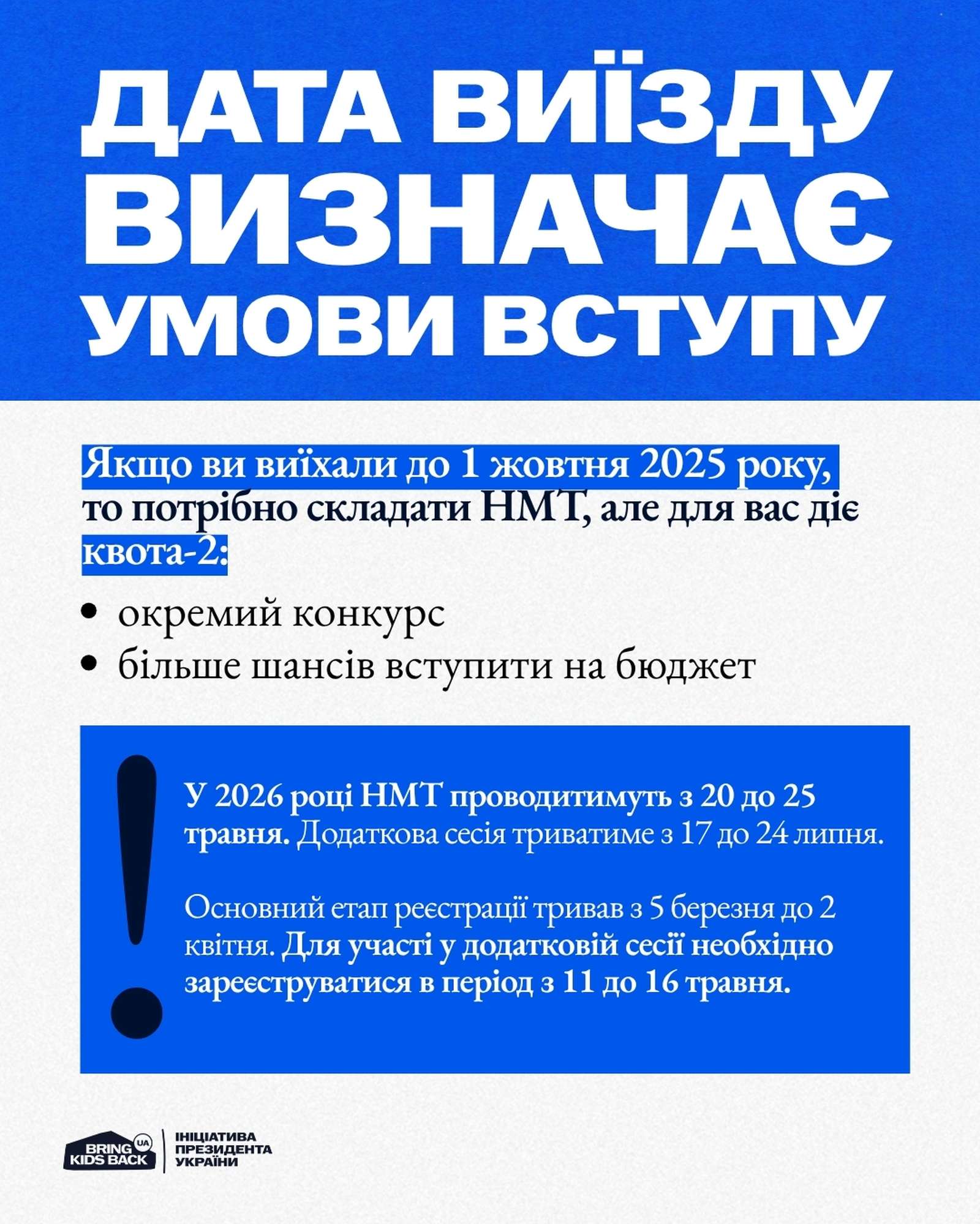 🔹Вступ без НМТ. Якщо ви перебуваєте на ТОТ або виїхали після 1 жовтня 2025 року, результат національного мультипредметного тесту не є обов’язковим. Замість нього можна пройти річне оцінювання та співбесіду безпосередньо у закладі вищої освіти.