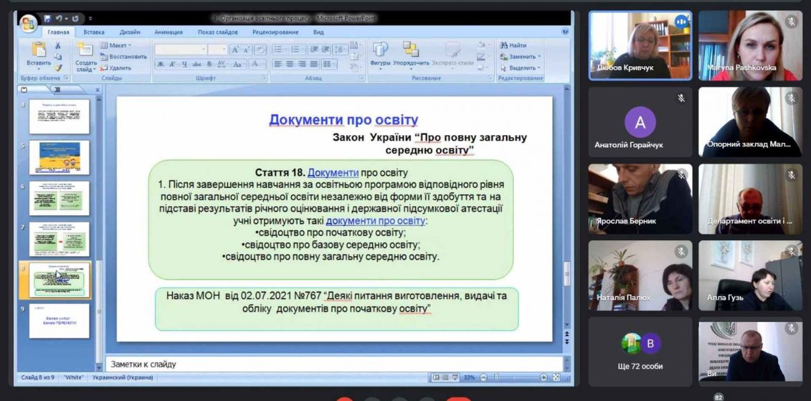 Для вироблення єдиної стратегії організації навчального процесу у поточних умовах Департаментом освіти і науки Рівненської обласної державної адміністрації спільно з Рівненським обласним центром перепідготовки та підвищення кваліфікації працівників органів державної влади, органів місцевого самоврядування, державних підприємств, установ та організацій 23 березня було організоване онлайн-навчання за спеціальною короткостроковою програмою підвищення кваліфікації «Організація освітнього процесу та використання ресурсів закладів освіти Рівненської області в умовах воєнного стану».