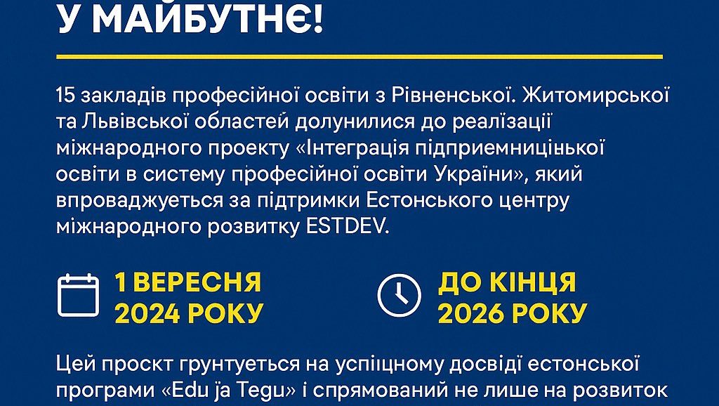З 1 вересня 2024 року заклади профосвіти Рівненщини беруть участь у міжнародному проєкті «Інтеграція підприємницької освіти в систему професійної освіти України». Ініціатива реалізується за підтримки Естонського центру міжнародного розвитку ESTDEV та триватиме до кінця 2026 року.