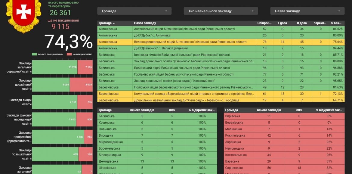 Процес вакцинації працівників закладів освіти триває! Департаментом освіти і науки Рівненської облдержадміністрації розроблено інтерактивну панель стану вакцинації у закладах освіти області.