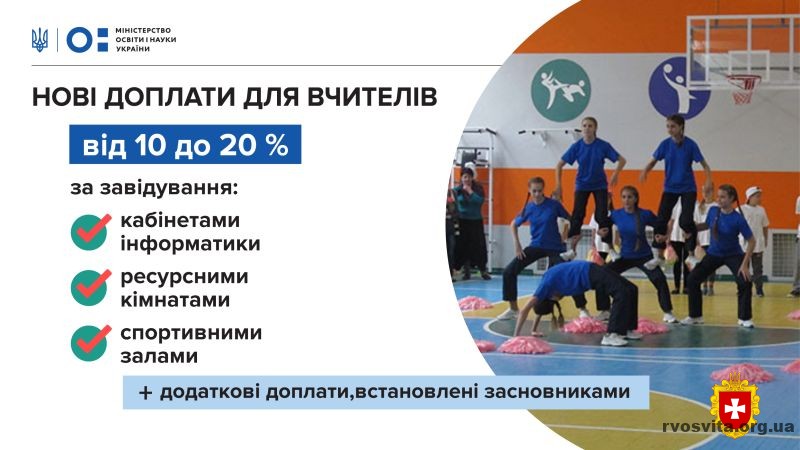 Більші можливості для зростання зарплати вчителя. Документ передбачає більше доплат для вчителів, зокрема від 10 до 20% від зарплати за завідування ресурсними кімнатами, кабінетами інформатики та спортивними залами. Окрім цього, педагоги зможуть отримувати додаткові доплати, які завдяки закону матиме змогу встановлювати засновник закладу.