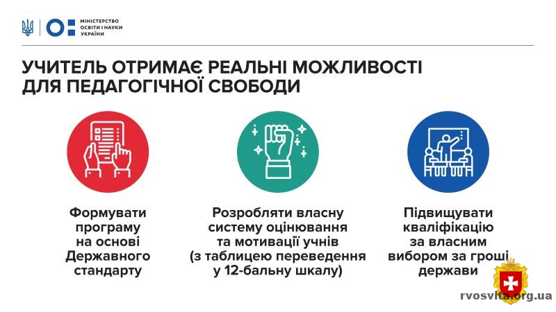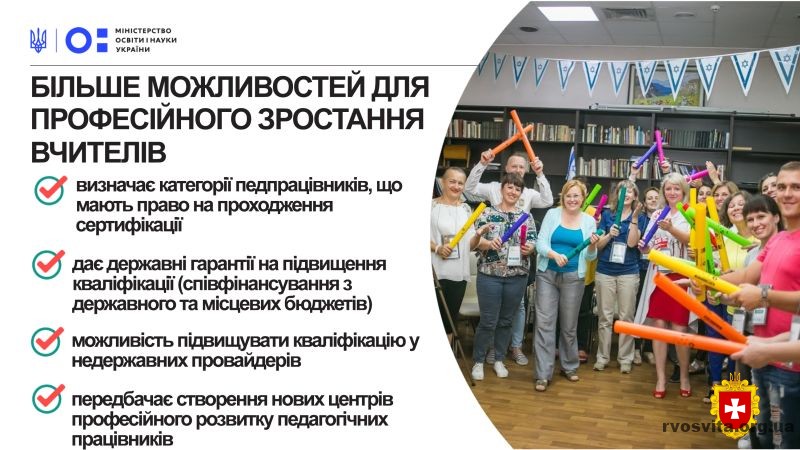 Більше можливостей для педагогічного зростання вчителів. Так, новий Закон встановлює державні гарантії на підвищення кваліфікації вчителя та передбачає його співфінансування з державного та місцевих бюджетів, можливість підвищувати кваліфікацію у недержавних провайдерів, створення нових центрів професійного розвитку педагогічних працівників.