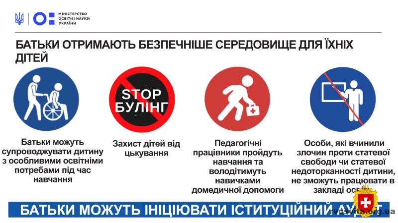Безпечніше середовище для дітей. Закон дає можливість батькам супроводжувати дитину з особливими освітніми потребами під час навчання, а також надає гарантії захисту учнів від булінгу. Окрім цього, документ передбачає обов’язкове навчання вчителів основам домедичної допомоги та закриває доступ у заклад особам, які вчинили злочин проти статевої свободи чи статевої недоторканності дитини.