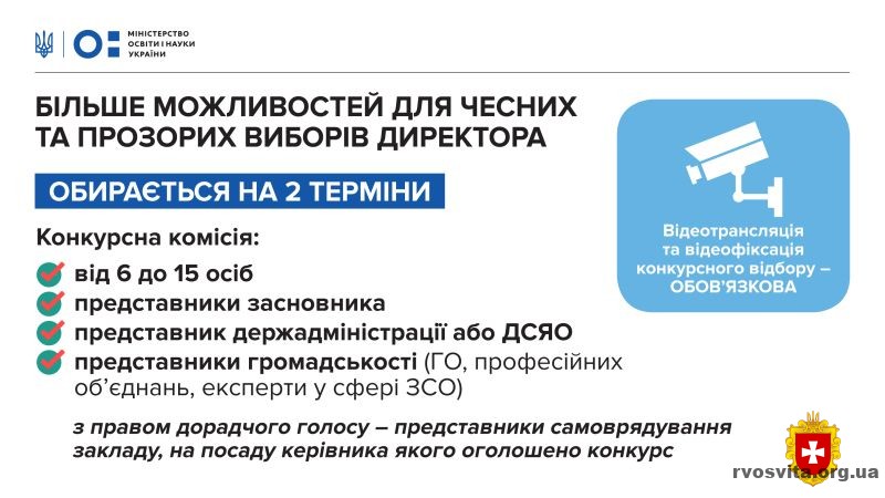Однак щоб ця змінність влади давала позитивні наслідки для розвитку закладу, мають діяти прозорі та чесні механізми виборів директорів. З урахуванням пілотування різних видів конкурсного відбору директорів Закон встановлює, що колектив школи та батьки відіграватимуть дорадчу роль під час виборів, але сам конкурс проводитиме незалежна комісія. Також обов’язковою є відеотрансляція та відеофіксація відбору. Це має мінімізувати використання адмінресурсу директором, а також вплив виборів на навчальний процес.