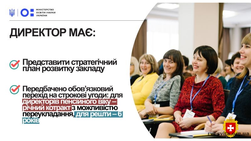 Нові підходи до призначення директорів шкіл. Згідно з Законом «Про освіту», директор може займати свою посаду не більше 2 термінів по 6 років поспіль в одному закладі.