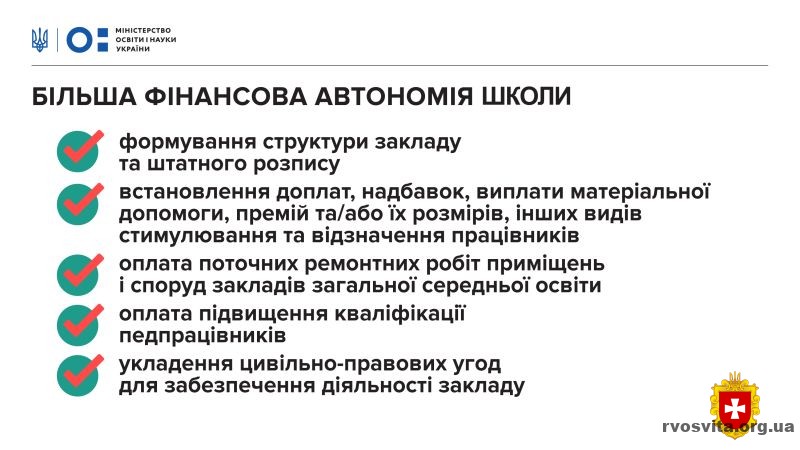 Фінансова автономія шкіл. Новоприйнятий Закон передбачає більше можливостей для шкіл у використанні власних коштів. Зокрема на: