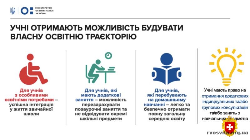 Вибір предметів учнями. Закон запроваджує право учнів обирати курси, навчальні предмети (інтегровані курси).