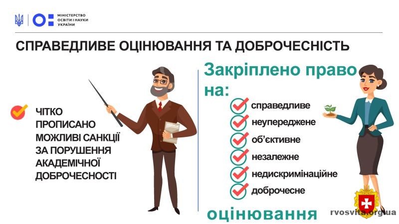 Право на справедливе оцінювання та вимоги до доброчесності. Закон вперше на законодавчому рівні встановлює право учнів на справедливе, неупереджене, об’єктивне, незалежне, недискримінаційне та доброчесне оцінювання результатів навчання, незалежно від виду та форми здобуття ними освіти.