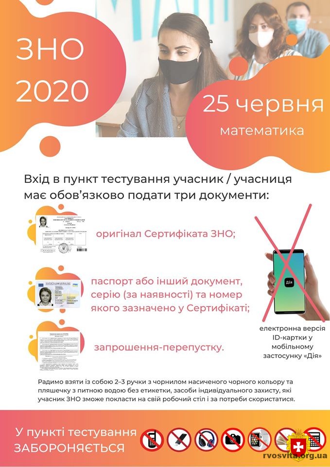 Враховані вимоги постанови щодо розсаджування учнів на відстані не менше 1,2 м один від одного. Розроблені маршрути переміщення учасників ЗНО та забезпечені інформаційними листами про необхідність дотримання респіраторної гігієни та етикету кашлю тощо.