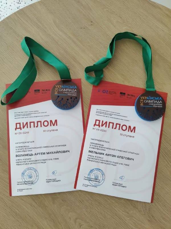 Учні Обласного наукового ліцею м. Рівне Артем Волинець та Антон Мельник здобули дипломи ІІІ ступеня на IV етапі Всеукраїнської учнівської олімпіади з інформатики!