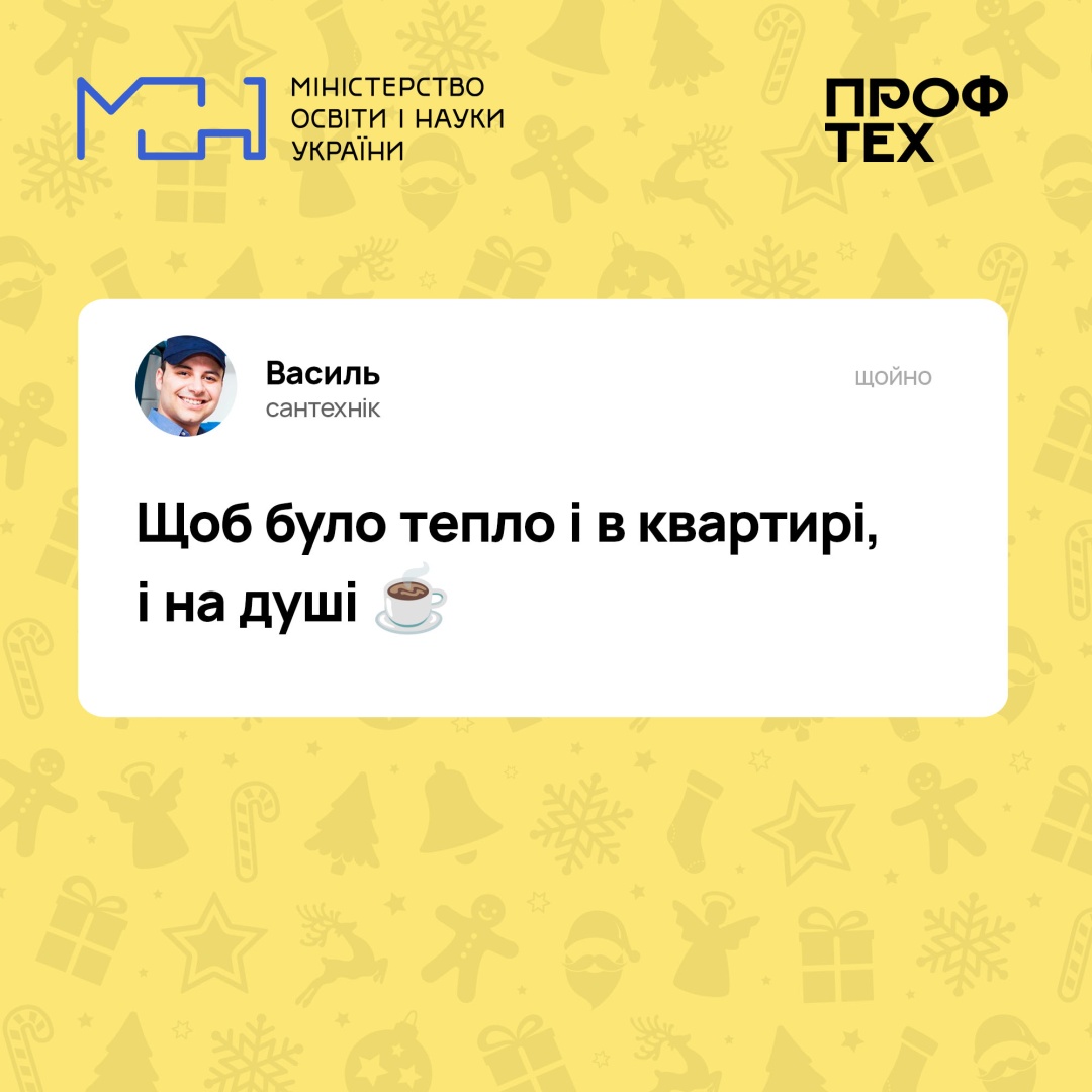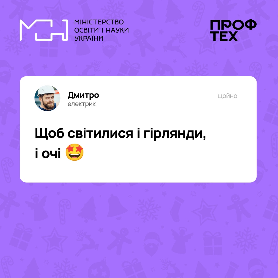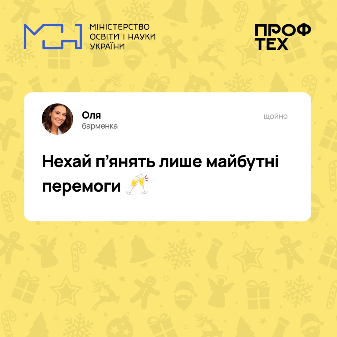 Робітничі професії безцінні!опубліковано 02.01.202302.01.2023 Професійна освіта Переглядів: 26 Позаду нелегкий рік, однак ми прожили його гідно та сміливо. Попереду – тільки перемога! Зі світлом, теплом, рідними поряд і без поганих сусідів. Привітати зі святами також спішать наші фахівці робітничих професій Ловіть листівки від них Поширити: Надрукувати:
