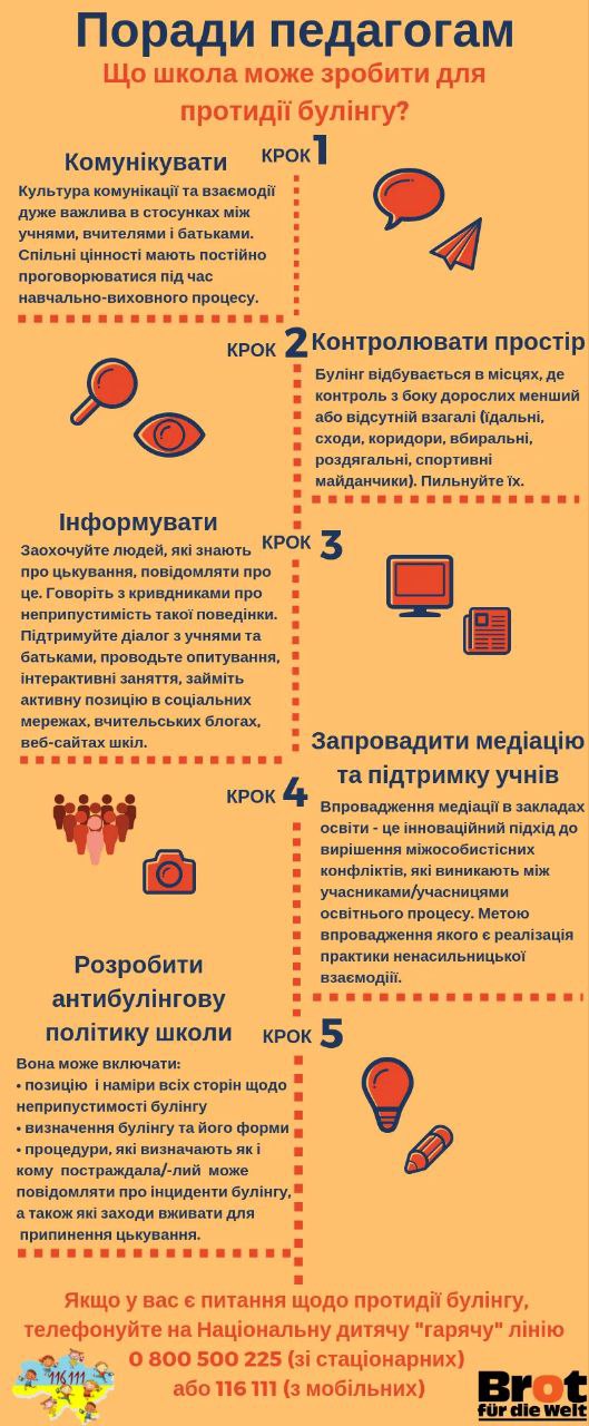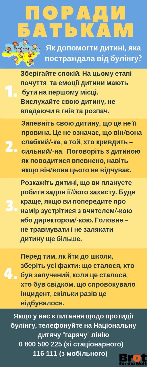 Сьогодні ми б хотіли нагадати освітянам, що школа може зробити для протидії булінгу, а також порадити батькам як допомогти дитині, яка постраждала від булінгу. Детальніше про це читайте в інфографіках під дописом.