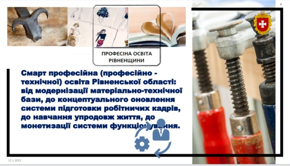 Смарт-професійна освіта Рівненської області: від модернізації матеріально-технічної бази до концептуального оновлення системи підготовки робітничих кадрів, до навчання упродовж життя, до монетизації системи функціонування. Про перспективи розвитку професійної освіти області йшла мова на нараді директорів закладів професійної (професійно-технічної) освіти 13 січня 2023 року. На нараді розглянуто питання: