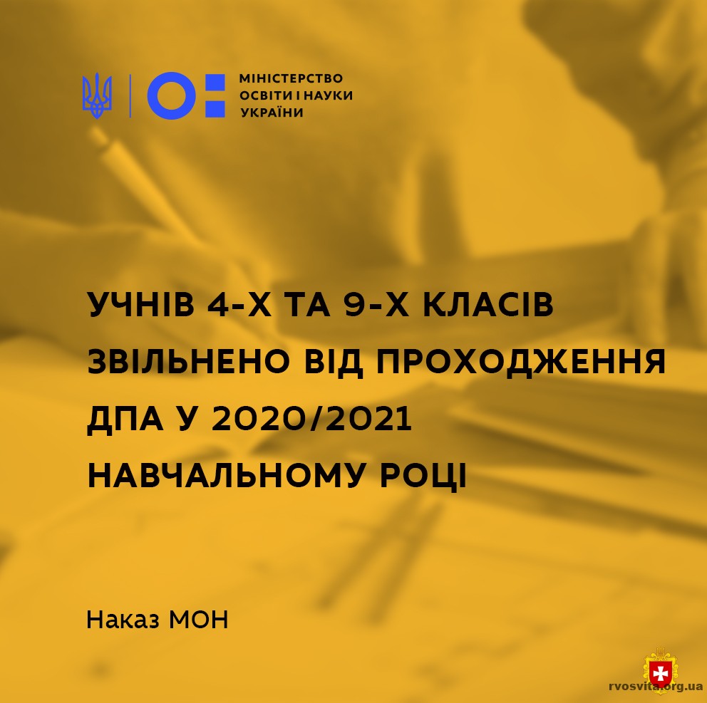 Зважаючи на це, МОН звільнило від проходження державної підсумкової атестації здобувачів закладів загальної середньої освіти 4-х і 9-х класів у 2020/2021 навчальному році.