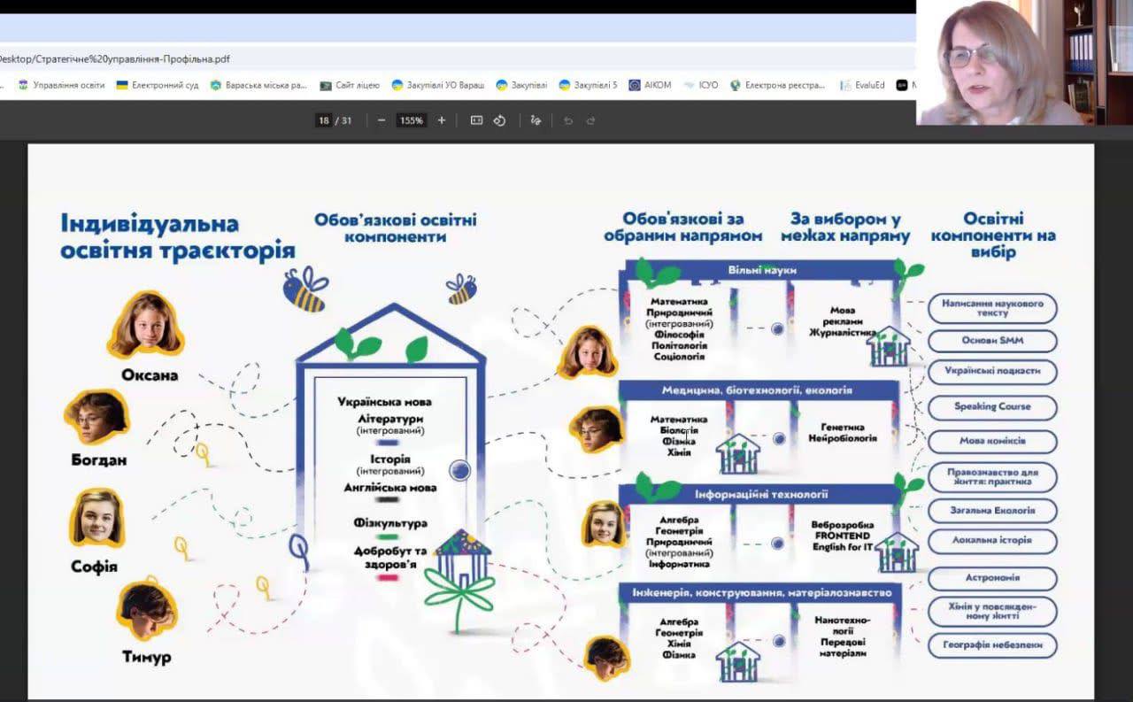 Учасникам також представили ключові напрями сучасного управління школою: розвиток професійної спільноти, забезпечення якості освіти, стратегічне планування, створення безпечного освітнього середовища, цифровізацію процесів, оновлення профільного навчання та сучасної виховної системи.