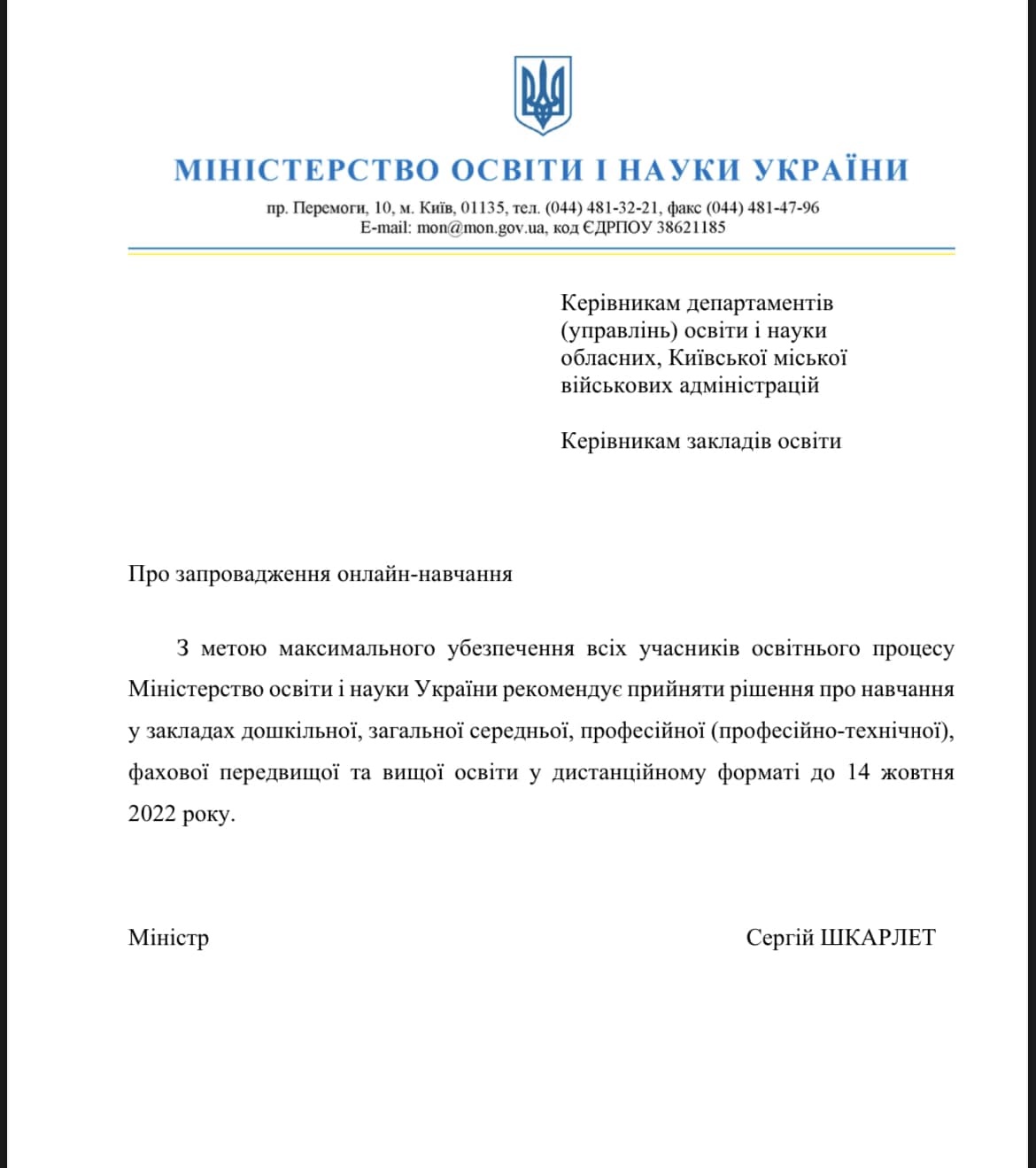 “Наше завдання максимально убезпечити всіх учасників освітнього процесу. Безпека – понад усе! Життя і здоров’я кожного громадянина понад усе! Будь ласка, не нехтуйте правилами поведінки під час сигналу «повітряна тривога», спускайтеся в укриття. Бережіть себе!”, – зазначив Міністр освіти та науки України Сергій Шкарлет.