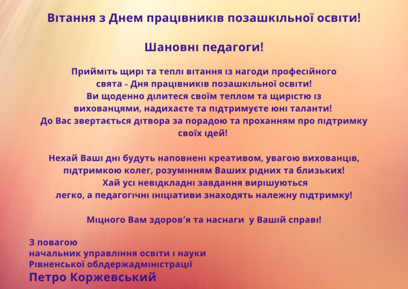 Вітання з Днем працівників позашкільної освітиопубліковано 25.09.202025.09.2020 Переглядів: 2 344 Поширити: Надрукувати: