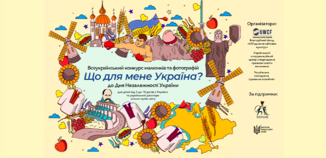 З метою культурно-освітнього розвитку, формування у дітей і підлітків національної ідентичності, патріотичного виховання; соціальної підтримки талановитої молоді, сприяння їх самореалізації та творчому розвитку, активного залучення творчої молоді до соціально-вагомої діяльності, Благодійний фонд «Об’єднання світових культур», Український координаційний центр з підвищення правової освіти населення, Українська молодіжна правнича асамблея за підтримки Департаменту молоді та спорту Київської міської державної адміністрації, Міністерства молоді та спорту України, проводять Всеукраїнський конкурс малюнків та фотографій «Що для мене Україна?», приурочений до Дня Незалежності України.