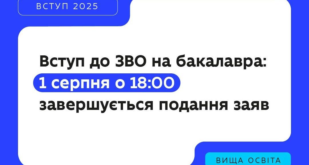 Нагадуємо, що прийом заяв на вступ до закладів вищої освіти на бакалаврат або медичну магістратуру (на бюджет або контракт) триватиме до 18:00 1 серпня 2025 року.