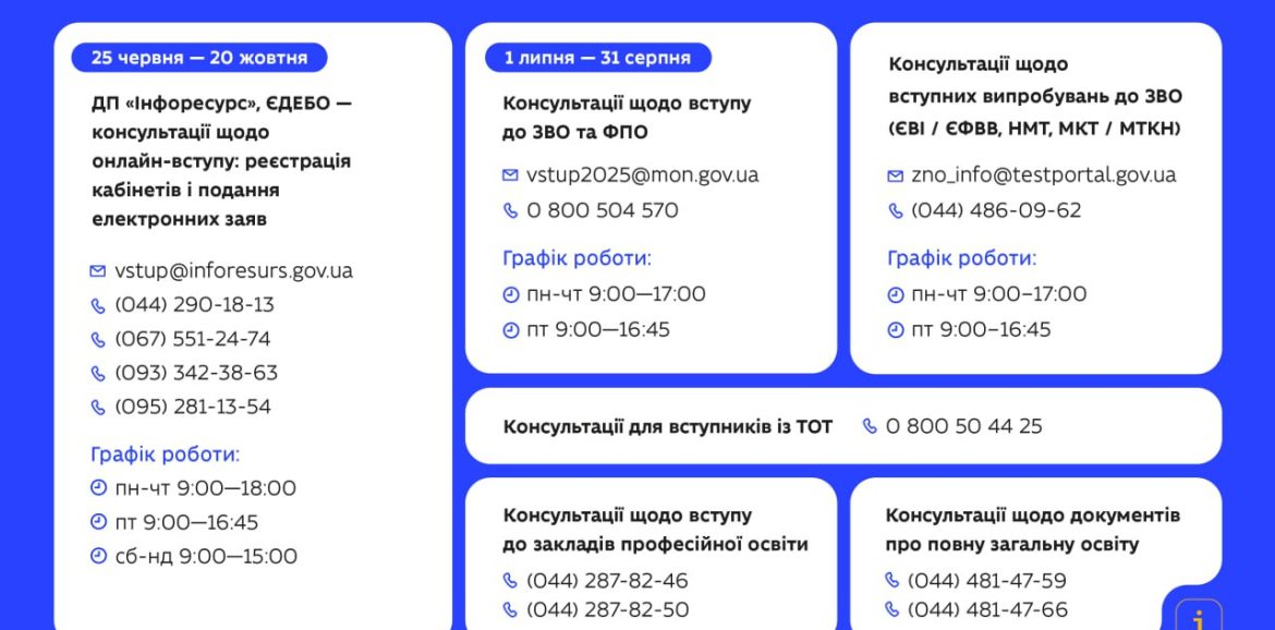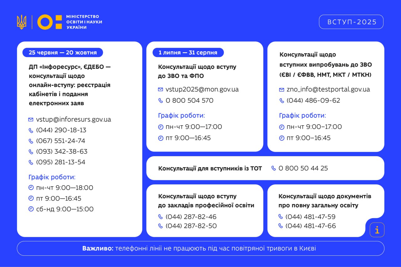 Для оперативної підтримки учасників вступної кампанії у 2025 році запрацювали консультативні гарячі телефонні лінії. Вступники, їхні батьки та представники закладів освіти можуть отримати роз’яснення щодо подання заяв, функціонування електронних кабінетів, умов вступу та інших організаційних питань.
